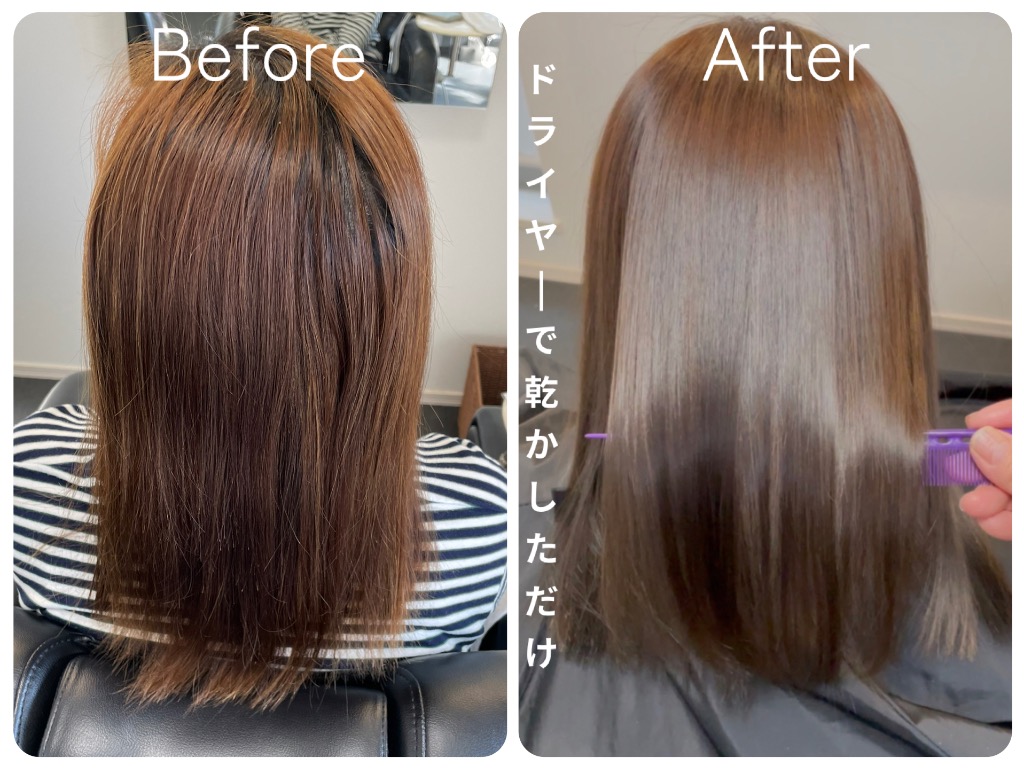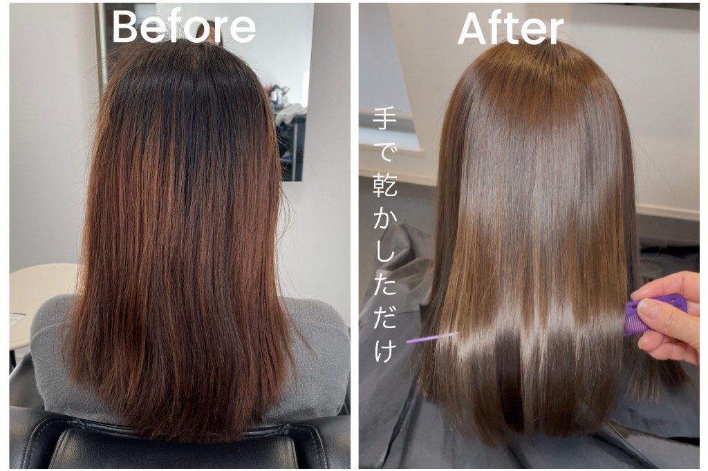 髪質改善カラーは、ヘアカラーと同時にトリートメントや補修成分を髪の内部に浸透させ、ダメージをケアしながら染める技術です。ツヤ感、手触りの向上、色持ちの良さが特徴で、カラーを繰り返す人や乾燥・くせ毛が気になる人に最適です。通常のカラーが色味を入れること主体なら、髪質改善カラーは「健康な髪を維持・改善」することに重点を置いています。そのため、施術時間が少し長くなります。